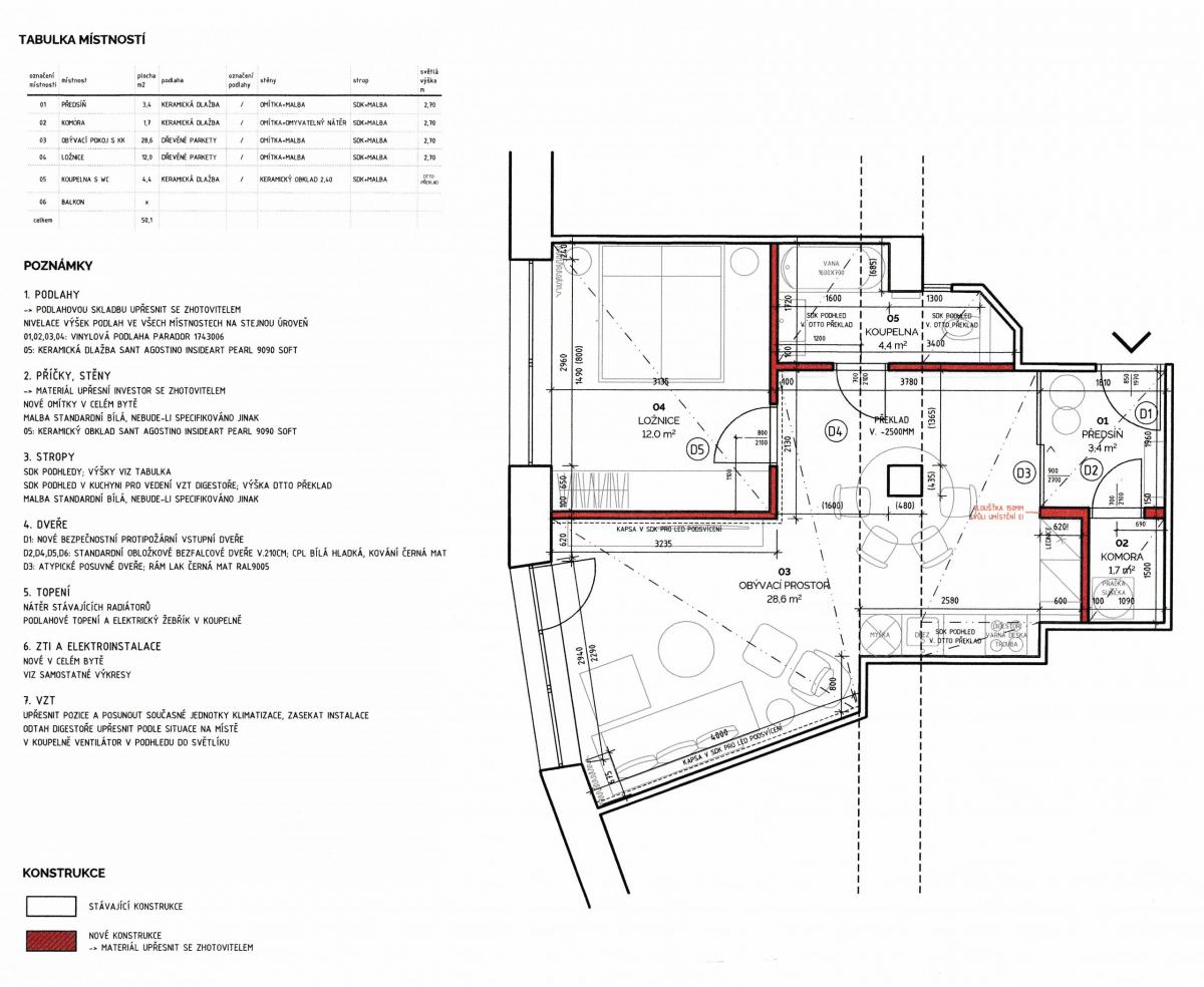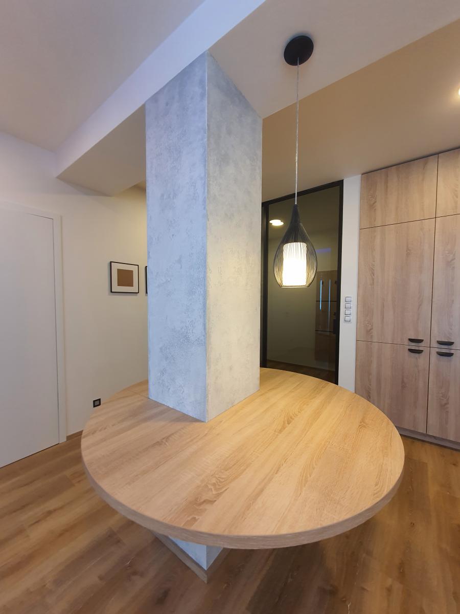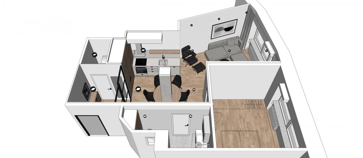 V roce 2020 vznikl architektonický návrh pro celkovou rekonstrukci bytu se změnou dispozice. Koncept převážně obsahoval dekor dubu, alpskou bílou, beton a černé doplňky.